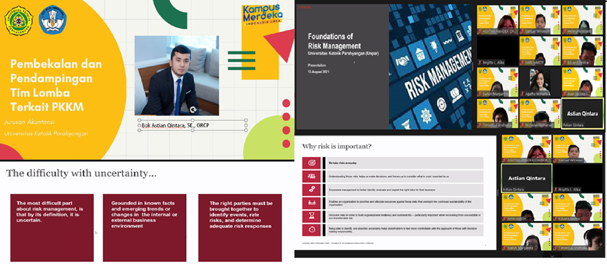 On this occasion, he presented a very interesting Risk Management theme to provide knowledge for the Accounting competition team of the Faculty of Economics at Parahyangan University. Risk is the impact of uncertainty when a company or individual is trying to achieve its goals. The COVID-19 pandemic is one example of the risks faced by companies and individuals today. With the emergence of this pandemic risk, technology has become more frequently used. This means that with risk, we can still take opportunities in order to continue to achieve goals. Therefore, risk management is needed to mitigate existing risks. Risk management is a process to identify, prioritize, and manage key risks to company goals. Therefore, a future mindset is needed for this risk management. An enterprise risk management program is an activity that is packaged to carry out risk management in the company. Understanding risks will help us make decisions, and by understanding the risks, the company will be more able to survive. There are several difficulties faced when identifying risks, such as the fact that risks are uncertain, there are changes in both the internal and external business environments, and the involvement of related parties is needed in order to identify events and risks.