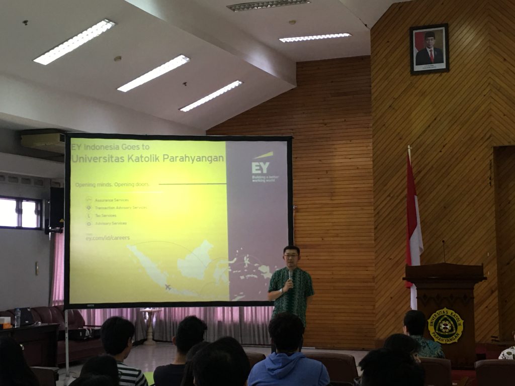 EY Indonesia goes to UNPAR merupakan acara yang diselenggarakan rutin setiap tahun dalam rangka pengenalan profil Kantor Akuntan Publik Purwantono, Sungkoro dan Surja (EY Indonesia ) dan campus recruitment. Acara ini diselenggarakan dimulai pada tanggal 27 Februari 2020 dengan agenda technical meeting bersama HMPSA, dilanjutkan pada hari ke-2 tanggal 28 Februari 2020 yang terdiri dari tiga sesi, diantaranya: sesi 1) EY preliminary assessment , sesi 2) Company presentation dibawakan oleh Bapak Komala Widjaja (Assurance Partner Representative) , sesi 3) Interview session bertempat di Aula Gedung Fakultas Ekonomi, Universitas Katolik Parahyangan. Acara ini diawali dengan kata sambutan yang disampaikan oleh Bapak Ivan Prasetya, SE., MSM., M.Eng (Wakil Dekan Bidang Kemahasiswaan dan Alumni UNPAR). Acara EY Goes to UNPAR dihadiri oleh Tim HRD EY dan 40 peserta yang terdiri dari alumni dan mahasiswa Jurusan Akuntansi UNPAR semester 7 dan 8.