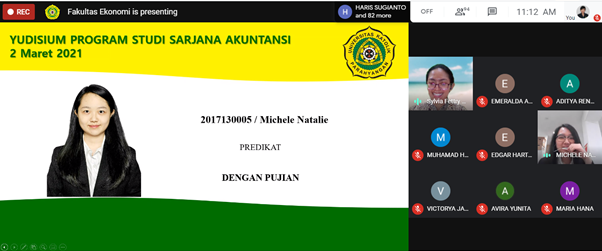 Selasa, 2 Maret 2021 Program Studi Akuntansi FE Unpar telah menyelenggarakan acara yudisium secara online dengan menggunakan platform gmeet. Walaupun diselenggarakan secara online, namun acara yudisium tetap dapat dilaksanakan dengan hikmat. Rangkaian acara yudisium ini terdiri dari: menyanyikan lagu kebangsaan Indonesia Raya, doa pembuka yang disampaikan oleh Ibu Dr. Amelia Setiawan, SE., M.Ak., Ak., CISA ( Wakil Dekan Bidang Akademik), sambutan Ibu Dr. Paulina Permatasari, SE., M.Ak., CMA., CSRS., CSRA (Ketua Jurusan Ilmu Akuntansi), penyampaian pesan – pesan dari dosen-dosen Program Studi Akuntansi, pernyataan yudisium untuk 73 peserta, pesan dan kesan peserta yudisium yang diwakili oleh Michele Natalie dan Kevin Kurnia Hermawan, foto bersama, mars FE Unpar, doa penutup disampaikan oleh Ibu Dr. Elizabeth Tiur Manurung, M.Si., Ak., CA., CIRR, dan acara ditutup oleh Ibu Dr. Sylvia Fettry EM, SE., SH., M.Si., Ak (Ketua Program Studi Akuntansi). Selamat kepada para lulusan yang telah menyandang gelar Sarjana Akuntansi, semoga sukses, selamat berkarya di tengah masyarakat, dan semoga Tuhan selalu menyertai langkah para lulusan Program Studi Akuntansi 2021. Berikut peserta yudisium yang telah berhasil mendapatkan predikat dengan pujian: